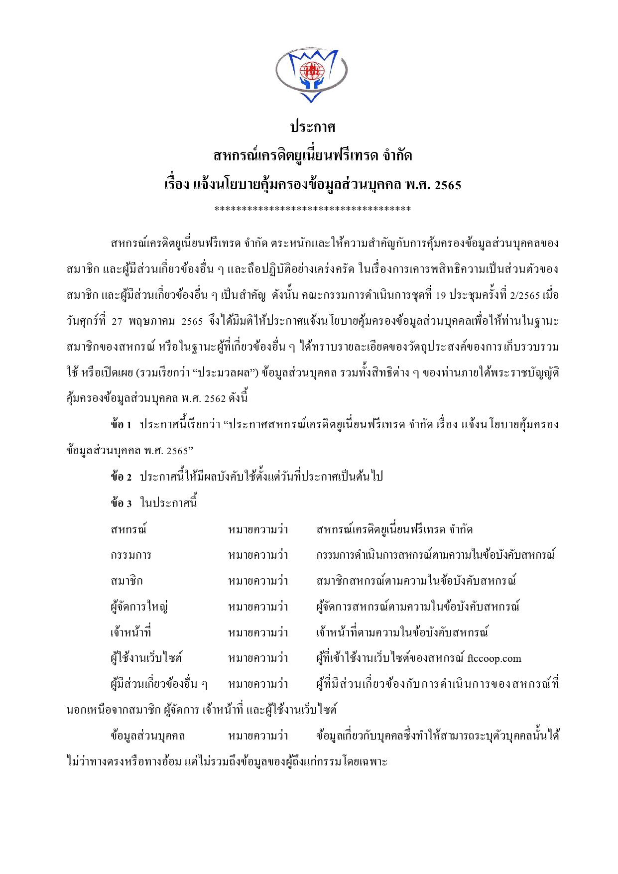 ประกาศสหกรณ์ฯ เรื่องแจ้งนโยบายคุ้มครองข้อมูลส่วนบุคคล